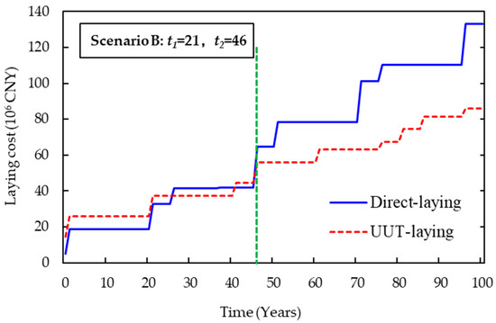 It can be seen from Figure 6 and Figure 7 that when considering the expansion of distribution network, the payback period of the power company is shortened from 51 years to 26 years under Scenario A, and 46 years in the case of Scenario B. The power cable laying cost reduction of the power company within the life cycle of UUT is increased from 6.44 million CNY to 40.22 million CNY (under Scenario A) and 47.37 million CNY (under Scenario B), respectively. The earlier the distribution network is expanded or rebuilt, the shorter the payback period is, and the higher the economic benefit of UUT-laying power cables is. Generally, in the life cycle of UUT (usually 100 years), the expansion of distribution network and the transformation of power pipelines caused by the growth of regional energy consumption and the development of distributed generation are inevitable [27]. Therefore, it can be concluded that the use of UUT-laying power cables in place of traditional buried cables in areas with rapid load growth has great economic benefits.
