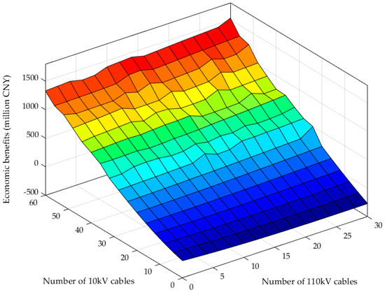 In addition, the relationship between the number of cables of different voltage levels laid in the utility tunnel and the economic benefits of the power company is shown in Figure 8. The upper limit of the number of 110 kV cables laid in the high-voltage power cabin is 30, and the upper limit of the number of 10 kV cables laid in the integrated cabin is 60.