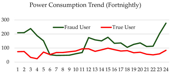 The study was carried out on a collection of real electricity consumption data of consumers, which was made available by the State Grid Corporation of China (http://www.sgcc.com.cn/). Table 1 presents the metadata information about the dataset. The dataset is composed of electricity consumption signatures of 9655 consumers over 1 year. Our primary observation revealed that a normal user and an abnormal user generate different patterns of electricity consumption. Figure 2 displays the fortnightly consumption of two consumers; one is a normal user and the other is an electricity thief. The consumption trend indicates that an abnormal or electricity theft user has a pattern that fluctuates more than a normal user.