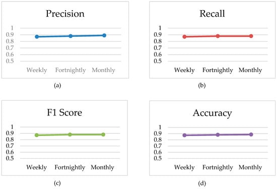 Effect of weekly, fortnightly, and monthly consumption patterns on the model. (a) Precision; (b) Recall; (c) F1 Score; (d) Accuracy.