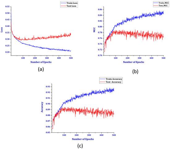 (a) Loss, (b) MCC, and (c) accuracy for the balanced dataset.