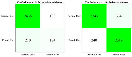 The confusion matrices are compared in Figure 11 for both cases, where the impact of increasing the number of instances in the data set is clearly reflected. In the first scenario, the model had a severe performance loss when classifying fraud users. This is because in the initial dataset were for electricity thieves. Later, after processing, those instances were increased, and the model was able to classify between the minority class and the theft users considerably well. In every instance, 80% of the data were used for training and the remaining 20% were used as validation data. The confusion matrices for the corresponding methods are given in Figure 11.