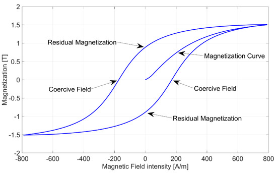 Most of the studies use a vector hysteresis model associated with FEA to calculate the hysteresis torque. Usually, the Jiles–Atherton model [16] or Preisach model [17] are adopted. The first model adopts the following equation for the numerical determination of hysteresis parameters: