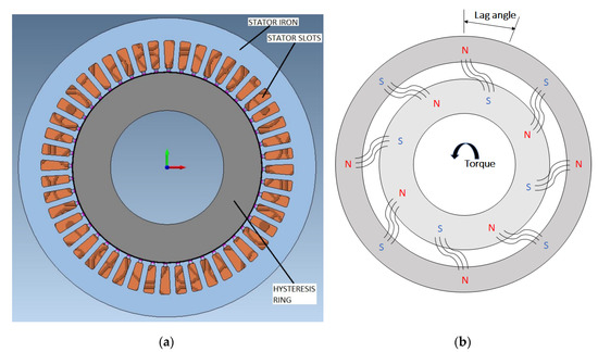 When the stator is fed by a set of 3 sinusoidal currents out of phase by 120 degrees, a rotating field is established at the airgap. Because of the hysteresis behavior, the flux density in the rotor material will lag behind the rotating field. This space angle between the rotating field and the flux density generates a torque [13]. From a qualitative point of view, the stator field creates poles on the rotor through magnetization and these poles follow the rotating field and pull the rotor along, as shown in Figure 2b. Neglecting hysteresis, the cycle of magnetization and demagnetization would be a reversible process. Conversely, due to hysteresis, the magnetized region tries to remain magnetized by following the stator field; thus, the rotor is pulled along by the poles [14]. The torque will be proportional to the hysteresis losses in the ring.