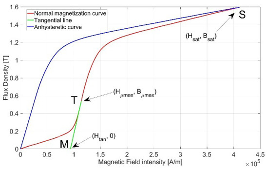 where is the value of the magnetic field intensity derived from the magnetostatic simulation, is the intercept of the tangential line at the point of maximum permeability of the normal magnetization curve, is the value of at the point of maximum permeability, is the coercive field at the maximum saturation level, is the maximum value of and is the value of in the plane, where is the value of in the anhysteresic curve, as shown in Figure 3. The blue curve is the anysteretic curve and represents the relationship between the values of in the curve MTS and . has the expression presented in Equation (9), while can be calculated by Equation (10).