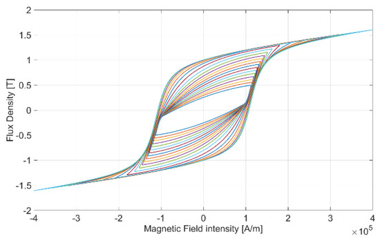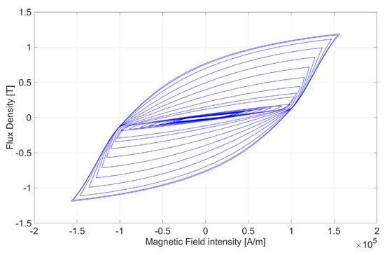 In the first step, a magneto-static FEA is performed using the opensource software FEMM [23]. Only one magneto-static simulation is required, and it lasts at most 20 s. Then, the hysteresis region is discretized along the radial direction; the maximum value of the circumferential and radial components of the flux density, Btan and , for each discrete radius of the hysteresis region is evaluated and stored. In fact, the value of for each element calculated at a fixed radius does not change because each element will reach the same saturation level, during an electrical revolution of the magnetic field. Each maximum value of the flux density and the corresponding value of the magnetic field intensity are the input for a hysteresis model and are used to create the corresponding minor loop. The shape of these minor loops is related to the actual value of the coercive field, which depends on the saturation level. The coercive field for each value of maximum flux density is evaluated, according to equations presented in [20], as (8):