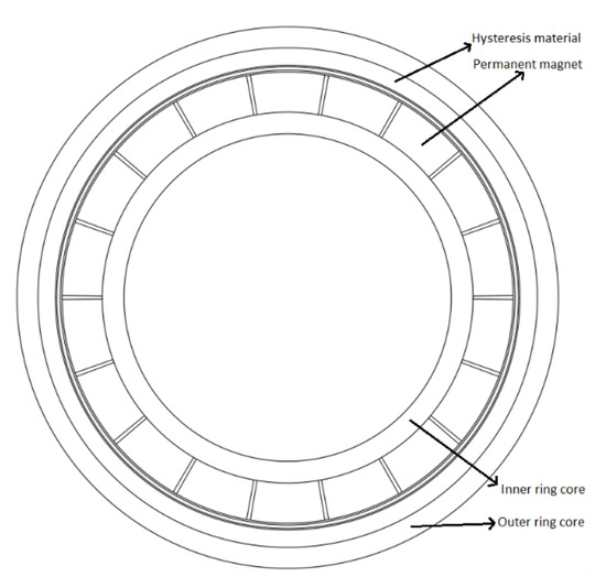 The simulated machine is a hysteresis clutch with an inner ring composed of 18 NdFeB magnets and an outer ring composed of a hard ferromagnetic material (AlNiCo 9). The inner ring is the field generator and the outer ring is the hysteresis element. The inner and the outer cores are composed by solid magnetic steel (Figure 7). The main specifications of the machine are reported in Table 4.