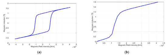 The major loop of the hysteresis material is reported in Figure 8a, whereas Figure 8b shows its normal magnetization curve implemented in the finite element formulation.