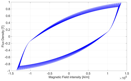For each value of and extracted from the magneto-static simulation, the area of the corresponding hysteresis loop is computed. If the machine is circumferential or radial and the thickness of the hysteresis region is small, it is possible to evaluate the torque considering the maximum value of the flux density, because, in these cases, the peak value of the flux density does not change with the radius. In this way, the torque can be computed considering only one hysteresis loop and the whole volume of the hysteresis region. Otherwise, it is necessary to calculate the hysteresis energy for each component, radial and circumferential, by Equation (11):