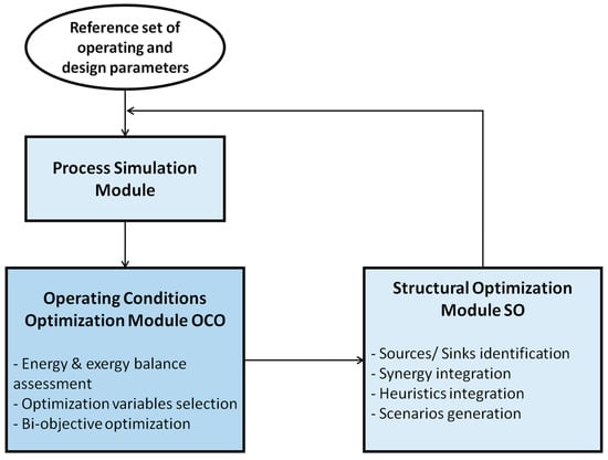 The SO module is founded on the previously established exergy and energy balances that are systematically examined in the aim of detecting existent synergy patterns. However, limiting the synergy matches to the existing system streams in their form (e.g., internal heat recovery that can be identified by the pinch method) can yield to missing out on prospect synergies. These prospect synergies will be identified if the process is structurally modified in many cases that can be considered separately or combined together: