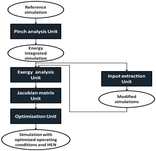 The proposed method consists of three modules developed and connected to each other via a coded script in order to design a new systematic approach ensuring a global optimization of the industrial processes while coupling the exergy and energy integration approaches. According to Figure 1, the reference set of operating and design parameters is first modeled using a simulation software. PRO/II ® [48] was used in this work. The interaction between the modules’ units resides in controlling, decoding, and creating the different PRO/II® files via Python.