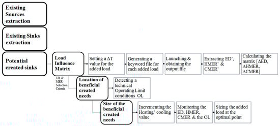 Based on the energy and exergy balances entry, the module sorts existing availabilities and existing needs. Besides existing demands, the module evaluates the load influence matrix (LIM) depicting non-existing loads that can potentially contribute to the process improvement and amasses them to the existing demands to form the propitious needs list. Later, synergy opportunities between the existing availabilities and the propitious needs are investigated via appropriate energy conversion systems or energy exchanging devices. In a parallel path, the library of predefined heuristic design modification is examined in the aim of finding potential design improvements. The execution of each design modification generates a different scenario that can be combined to other scenarios. The selected scenarios might undergo another methodological loop in order to optimize the operation conditions of the new architecture. It is noted that the user can intervene at any point of the sequence to interrupt the loop, omit certain design scenarios, or skip a module.