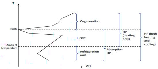 This combination of the pinch method and the exergy was further developed with Feng and Zhu [24] introducing the exergy grand composite curve (EGCC) (energy level with respect to enthalpy) and representing the energy and exergy balances of the entire system, including rotating machinery and separation equipment. The area between the composite exergy curves represents exergy losses generated by heat transfer or work. In extension, these graphs also allowed to optimally design utilities and conversion systems around a process. In this context, a “preselect” algorithm that preselects and pre-designs different types of thermodynamic conversion systems using exergy analysis is presented by Thibault et al. [47]. These conversion systems include cogeneration, heat pumps, refrigeration and absorption systems placed and sized in order to improve the energy recovery in the process and consequently reduce the energy consumption.