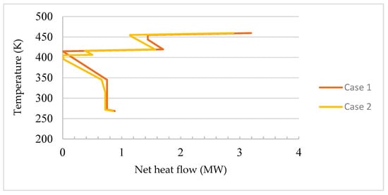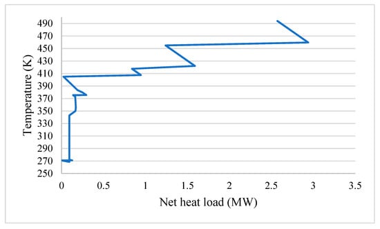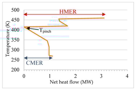 - MER calculation: The pinch temperature and the minimum energy requirements (MER) of the studied process are calculated according to the problem table algorithm given by Linnhoff and Flower [49], which is the most intelligible and uncomplicated numerical method for determining the required properties. The MER represents the external heating and cooling utilities required in a process. It indicates the remaining duties to satisfy when maximum energy is recovered from the hot and cold streams of the process.