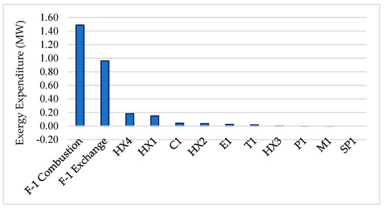 Consequently, the exergy efficiency is defined in Equation (7) as the ratio of the exergy outputs to the exergy inputs of the system. The outputs represent the exergy obtained as desired output and the inputs are the expenses coming from an exergetic source that has been employed.