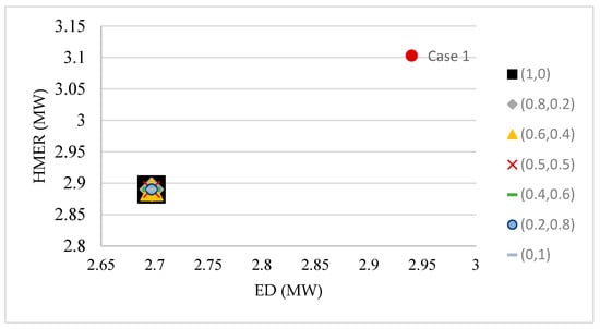 After selecting the most influencing variables on the exergy destructions function and the direction of their modification, the module reaches the numerical optimization step. The numerical optimization should be a multi-objective one taking into account the total ED function, calculated in the exergy analysis unit in Equation (6), as well as the MER function calculated according to the problem table method in the pinch analysis unit (3.2.1). The PRO/II® optimizer is single-objective using successive linear programming to solve non-linear optimization problems. That is why; the multi-objective optimization is scalarized and formulated as a single-objective optimization problem such that optimal solutions to the single-objective optimization problem are Pareto optimal solutions to the multi-objective optimization problem. A general formulation for the scalarization of a multi-objective optimization considers the weighted sum method demonstrated in Equation (11).