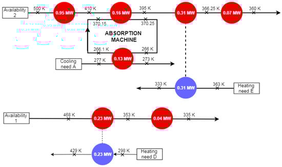 The first step is to classify the existing energy sources and sinks provided by the energy and exergy balances along with data concerning the type of their heat exchange (heating/cooling), their inlet and outlet temperature values, their duty and their minimum temperature approach when exchanging with another flow. In fact, the input simulation contains energy sources and sinks that were not matched in the pinch analysis unit of the OCO module. The existing sink forms the energy availability of the process. Valuable or not, they constitute waste energy at disposal originating from the heat rejection to the environment at different temperature levels. This availability is not valorized by the HEN design because of the non-conformity between their load, temperature levels value, and the remaining needs.