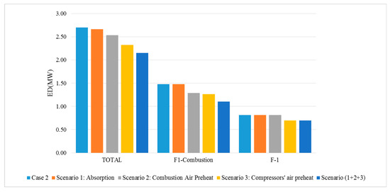 Exergy destruction values are quantitative parameters that allow evaluating the irreversebilities and subsequently locating the exergy destructive unitary operation. However, these values do not give indications on the potential improvement means of the system and therefore do not guide the optimization. To be able to systematize the optimization procedure, it is fundamental to find both a quantitative and indicative parameter of the system. This parameter must first give an indication on the variation of the exergy destructions in order to be able to develop the optimization approach in such a way as to propose possible improvements. In this study, a new parameter is introduced to guide the improvement of the systems. This parameter is the derivative of the exergy destruction per operating parameter. The derivative of the exergy destruction function is the measure of the change rate of the exergy destruction with respect to the variation of a variable according to Equation (8). Consequently, to represent the influence of all the variables in the system on the exergy destruction and most importantly, to allow taking improvement actions upon this representation, the Jacobian matrix in Equation (9) is evaluated. This matrix represents all first-order derivatives of the vector function “total exergy destructions” () with respect to the extracted variables in the input extraction unit.