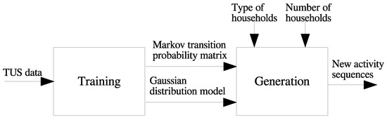 The solution for the activity simulation problem is based on a supervised machine-learning method (see Figure 1). We first use a TUS data set to train a simulation model, then use this model to generate synthetic activity sequences of a resident. The parameters of the proposed approach include a Markov chain transition probability matrix of describing the changes of identified activities for each household member, a Gaussian distribution model for generating the duration of an activity, and the type and the number of households. To facilitate data generation, a data generator is developed which is able to create activity sequences with these parameters as the input.