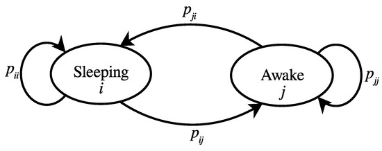 which represents the fact that, when a current state i is given at the time step k, the next state j is conditionally independent of the past states, noted as . At a discrete time step k, a transition probability matrix (TPM) with the size of can be created, where represents the number of states at the time step k. Each entry in the matrix represents the change probability between two states. The sum of the transition probability of a particular state to other states equals 1, i.e., . For example, the Markov chain of sleeping may have two possible states , and the possibility of moving from one state to another is determined by the transition probabilities, p (see Figure 2). Therefore, if a person is sleeping, there is a probability of that, in the next time interval, (s)he will be awake; or there is a probability of that, in the next time interval, (s)he will still be sleeping. Likewise, there are two possible transitions from awake. The corresponding TPM is