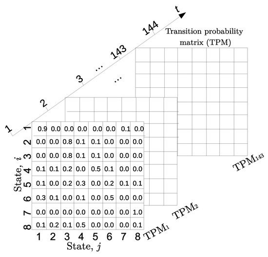 To train activity models using our TUS data (detailed in Section 5), we combine the activities into eight categories, each of which corresponds to a state in the Markov chain (see Table 2). As activities are time-dependent, we generate a total of 143 transition matrices based on our TUS data. The TUS data were collected for every 10 min, and have 144 time steps in total (see Figure 3). We assume that the potential states remain the same in all time steps, i.e., .