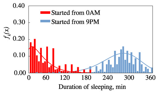 Figure 4 shows the examples of sleeping activities that started at 9:00 p.m. and 12:00 a.m., respectively, which are fitted by Gaussian distribution. The figure shows that the highest probability of the sleeping duration is 0–60 min for beginning to sleep from 12:00 a.m., and 240–300 min for starting to sleep from 9:00 p.m.