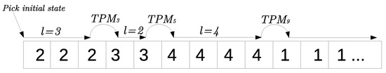 With these conditions, we now describe the generation process of the dependent sequence by the Algorithms 2–4 under the conditions (7), (8) and (9), respectively. The algorithms are self-explained and commented on. We suppose that the independent activity sequence has been generated, and will be used as the input for the algorithms. In addition, the set of activities, A, the TPM, , and the probability density function of each activity at each time step, , is augmented to generate a dependent activity sequence.