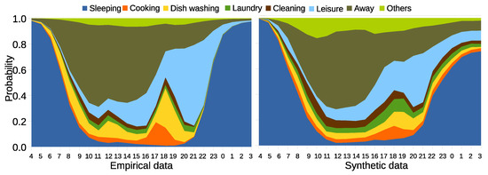 A number of research efforts were found on energy modelling incorporating user activities, mainly in the energy and building sectors. In the early work [6], a bottom-up approach was introduced to model the impact of user activities on demand-side management for residential households. According to individual activity patterns, Muratori et al. modelled the electricity demand of multi-family households [7]. Widen et al. [8,9] related residential electricity demand to occupancy profiles based on time-use survey data. Richardson et al. created a domestic electricity demand model based on UK’s TUS data [10], which can generate one-minute granular data for individuals, households, or neighbourhoods. Eoghan et al. investigated activity-based demand models suitable for demand-response simulations [11]. Many other works translate household routines into energy loading profiles, in combination with appliance parameters, including [8,10,12,13,14,15]. These works, however, focus on the application of user activities or behaviours in demand-side energy consumption modelling et al. and convert activities (based on time-use survey data) into energy consumption for an individual or a household. This also stresses the importance of incorporating user behaviour data to modelling tasks in order to obtain better results. These works, however, haven’t explained how to model user activities. Our work, instead, focuses on residential activity modelling, and its aim is to provide activity data to energy modelling tasks without breaking user privacy. As our model uses TUS data, we expect that the resulting activity data can be used for modelling energy load profiles accurately.