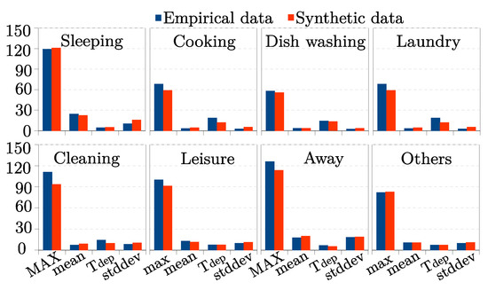 The quantitative measures for the eight activities are shown in Figure 7, which indicates that the synthetic data can simulate the empirical data well.