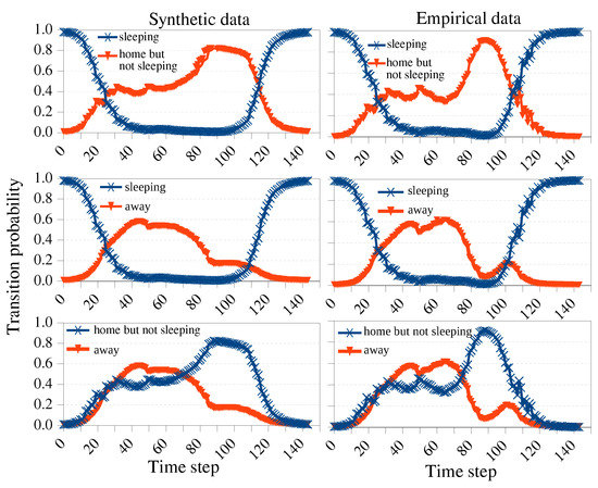State transition characteristic. Building occupancy is one of the most important factors that affect energy consumption in a building. Occupancy is therefore often used for energy load profiles modelling. For example, Aerts et al. [17] modelled building occupancy using three states including away, at home but awake, and sleeping as the three states are related to how energy is used in a broader category, e.g., active, inactive, or standby. We now further merge our categories into these three states and evaluate the transition probability by comparing with the real TUS data. The transition probability was computed using the same method as TPM, and they are visualized in Figure 8, instead of using a matrix. This figure reveals the time-dependent transition relation between any two of the states. For example, the top chart illustrates that during the late night and early morning people have a high probability of sleeping and staying at home, but, during the daytime, most people are not sleeping even when they are at home. The charts at the middle and the bottom can also be interpreted similarly according to the occupancy states. The charts on the left depict the occupancy transition states of the synthetic data, indicating that the model can capture the state transition characteristic from the empirical data (with a slight difference). The lines are slightly more smooth, which may be caused by the Laplace smoothing method.