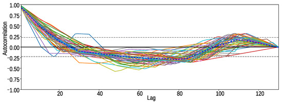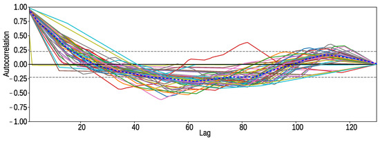 We calculate the autocorrelations for 50 time series randomly sampled from real and synthesised data. The results are shown in Figure 9 and Figure 10, respectively, where the solid lines represent the autocorrelations for individual time series and the dashed line represents the mean of the autocorrelations. According to the results, the autocorrelation lines have a similar shape for the real and synthesised time series.