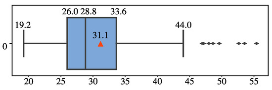 where represents the count of state s at the t-th time step in the empirical TUS data, while represents the count of the synthetic data; and represent the total number of time steps and the total number of states, respectively. We generate synthetic activity data for 100 times and compute the corresponding RMSE values. The resulting RMSE values are described by using the boxplot method (see Figure 11). Boxplot describes numerical data using the five parameters including lower fence, lower quartile, median, upper quartile and upper fence [26]. The length between the upper and the lower quartile is called interquartile range, . We label the five parameters and the mean value (the red triangle) directly in the figure. According to the results, the discrepancy to the empirical data varies, due to the stochastic property of using the Markov chain method. Therefore, users can select a threshold to decide if the generated data are acceptable or not, based on the RMSE values. For example, among others using a boxplot method, the data points lie outside the lower or the upper fence (i.e., ) are often regarded as outliers [27]. In this example, the threshold value of RMSE is 44.0 if a user has a loose requirement for the generated data.