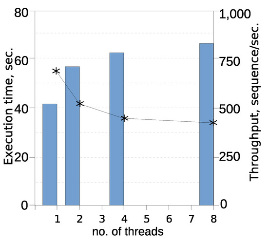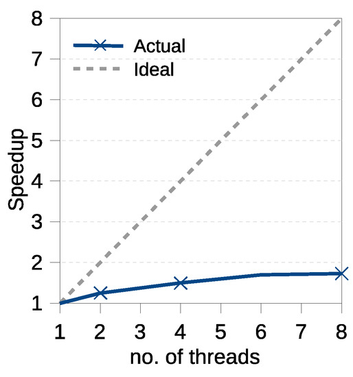 After validating the model accuracy, we now turn to evaluate the performance of running the algorithm. As mentioned earlier, the data generation model is generated once but can be re-used to generate data many times. We, therefore, only evaluate the data generation performance. As no other similar activity generators are found for the comparison, we solely report our performance. We generated 30000 activity sequences and measured the execution times when the number of threads was set to 1, 2, 4 and 8, respectively. Figure 12 shows the execution times, and the corresponding throughput. Figure 13 shows the speedup computed by the formula: , where represents the execution time without enabling multi-threading, and represents the execution time when the number of threads is or 8. According to the results, the performance is improved when multi-threading is enabled, and more threads are added. In terms of speedup, it can only achieve sub-linearly. We further explored the reasons and found that this was largely due to the IO-bound for the evidence that the I/O speed became more variable when multi-threading was enabled, with a speed of 2–8 MB per second. It may, however, also be related to the CPU as the CPU usage of all the cores became 100% for running threads, and note that the experimental laptop is equipped with a 4-core CPU.