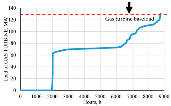 However, many gas turbine plants often work off design, especially in China. For example, Figure 1 shows the actual operating hours of a GE9171E gas turbine in a gas turbine power plant in Tianjin, China. The gas turbine baseload is 128.9 MW on the ISO standard condition, and the actual operating hours are approximately 6760 h in a year. According to Figure 1, the operating hours of the gas turbine are 6289 h under 50–90% load, which is the ratio between the operating power quantity and the rated power capacity. In particular, the operating hours are approximately 50% of a year for around 50% load. That is, the unit basically operates under partial load; thus, inlet air cooling technology is inappropriate.