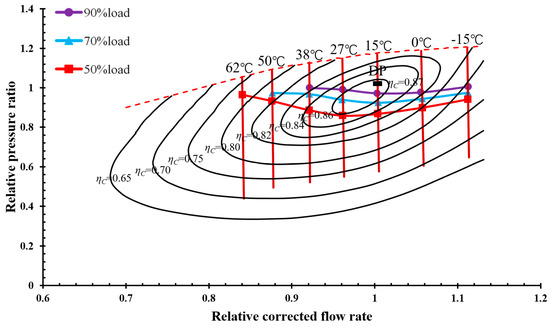 After comparison and analysis of performance changes in certain loads, the multiple equilibrium running lines of these varying loads can be drawn using the calculation method of the equilibrium running line. Thus, the partial loads of 90%, 70%, and 50% are selected for calculation and subsequently for the analysis of changes under partial-load equilibrium running conditions relative to inlet air heating. Then, the calculated equilibrium running points are drawn with the compressor characteristic line under 90%, 70%, and 50% load conditions, as shown in Figure 4. The designed point (DP) is also presented in Figure 5. The relative pressure ratio and corrected mass flow rate are both 1.0, and the compressor and turbine efficiency values are 0.88 and 0.92, respectively.
