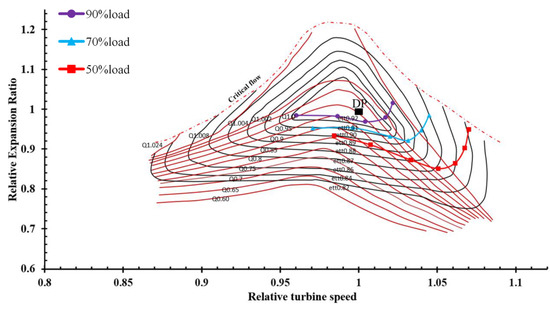 The same equilibrium running line calculation method is also adopted to analyze turbine performance. The same partial loads (i.e., 90%, 70%, and 50%) are selected for calculation. The equilibrium running points of the inlet air temperature, which are drawn from the turbine characteristic curve, are used to obtain the equilibrium running lines under 90%, 70%, and 50% load conditions, as shown in Figure 6.