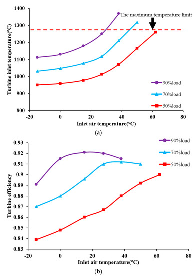 Quantitative analyses are performed on the basis of Figure 6 to determine the performance change in each equilibrium running point, as demonstrated in Figure 7a,b. These figures correspond to the variation curves of turbine efficiency and inlet temperature relative to inlet air heating. Figure 7a illustrates the gradual increase in turbine inlet temperature in which the increasing trend is significant relative to inlet air heating under the 90%, 70%, and 50% load conditions. For example, the turbine inlet temperatures are 950.98 °C at −15 °C and 1260.9 °C at 62 °C under the 50% load condition. An average increase of 5 °C in inlet air temperature requires an increase of 30 °C in the turbine inlet temperature. Turbine inlet temperature reaches the maximum temperature limit under the 90% load when the inlet air temperature is approximately 30 °C. Moreover, the turbine inlet temperature reaches the maximum temperature limit with 70% load when the inlet temperature is approximately 45 °C. In contrast, the maximum temperature limit under the 50% load condition is only realized when the inlet temperature reaches 62 °C. In summary, the turbine inlet temperature will reach its limit when the inlet air temperature rises to a certain temperature. Moreover, the higher the load, the faster the temperature reaches the limit under partial load conditions.