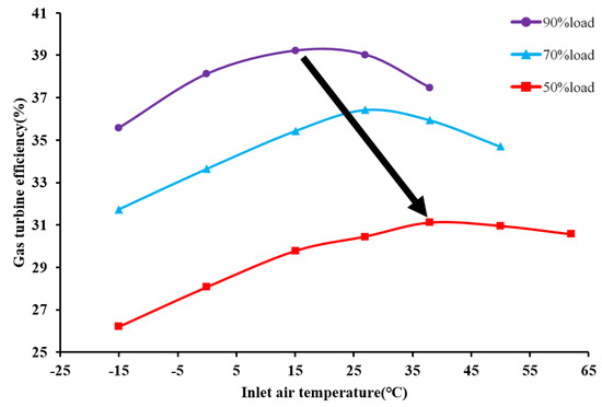 On the basis of the calculation of gas turbine efficiency (the ratio between the output power W and the fuel calorific value) at each equilibrium running point, the gas turbine efficiency on the equilibrium running lines relative to inlet air temperature is comprehensively analyzed under partial-load conditions (i.e., 90%, 70%, and 50%), as exhibited in Figure 8. Gas turbine efficiency increases and then decreases with inlet air heating under the three partial loads. This finding indicates that inlet air heating within a certain range benefits gas turbine efficiency, and the optimal inlet air temperature can be realized. In accordance with the comparative results, the maximum values of gas turbine efficiency are reached at 15 °C under the 90% load, 27 °C under the 70% load, and 38 °C under the 50% load. These values of maximum gas turbine efficiency for the different partial loads relative to varying inlet air temperatures represent a straight line. The lower the load, the higher the inlet air temperature. Consequently, the highest gas turbine efficiency is achieved and enhanced. Meanwhile, given the same load conditions, the lower the inlet temperature, the lower the gas turbine efficiency if the inlet air temperature is lower than the optimum value (15 °C at 90% load, 27 °C at 70% load, and 38 °C at 50% load). For example, under a 90% load condition, the gas turbine efficiency is 35.57% when the inlet temperature is −15 °C, and the maximum value is 39.21% at 15 °C, thereby indicating an efficiency improvement of 3.64%. Under a 70% load condition, the efficiency is 31.72% when the inlet temperature is −15 °C, and the maximum value is 36.43% at 27 °C, thus implying an efficiency improvement of 4.71%. Under a 50% load condition, the efficiency is 26.2% when inlet temperature is −15 °C, and the maximum value is 31.1% at 38 °C, thereby suggesting an efficiency improvement of nearly 5%. These findings indicate that the lower the inlet air temperature, the lower the gas turbine efficiency. In cases where inlet air heating technologies are used, the higher the inlet air temperature, the more evident the gas turbine efficiency improvement at lower loads.