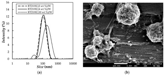 (a) Hydrodynamic droplet size distributions obtained by DLS [32] after PCME preparation and (b) SEM image of 4–month old RT21HC(2 wt.%)/water emulsion (1:20 diluted).