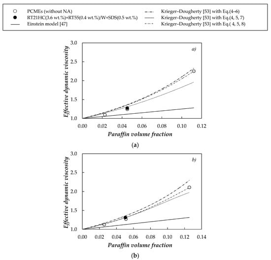 In the case of nano–emulsions stabilized with ionic surfactants (such as the SDS used in this work), effective/relative dynamic viscosity was observed to increase with dispersed phase volume fraction much more rapidly than for emulsions of larger droplets [27,56]. Figure 3 shows the effective viscosities of the studied PCMEs together with the values calculated with Einstein [47] and modified Krieger and Dougherty [53] models. It must be pointed out that a proper comparison between different nano–emulsions would require that all samples would contain the same amount of surfactant.