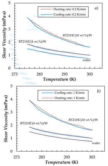 With the objective of analyzing PCMEs viscosity during droplets phase change, temperature ramp tests were performed at constant shear stress for water as well as 4 wt.% and 10 wt.% RT21HC/Water nano–emulsions. Samples were heated/cooled between 278 and 303 K at scanning rates of 0.2 and 1 K/min. A shear stress of 0.4 Pa, which corresponds to shear rates ranging from ~100 s−1 (at 278 K) to 240 s−1 (at 303 K) in the case of RT21HC(10 wt.%)/Water, was applied to ensure that viscosity values were collected in the Newtonian region (see Figure 2). The temperature evolutions of viscosity for water and the two analyzed emulsions at the two scanning rates are shown in Figure 4.