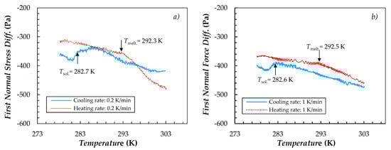 In order to further study possible structural rearrangements occuring during solid–liquid phase change transitions of PCM droplets, changes in normal stress during shear viscosity-temperature experiments were also analyzed. The temperature evolutions of first normal force difference for RT21HC(10 wt.%)/Water sample at the two scanning rates are shown in Figure 5. Heating and cooling thermograms at a scanning rate of 1 K/min obtained by differential scanning calorimetry in [32] are also shown for comparison (Figure 5c).
