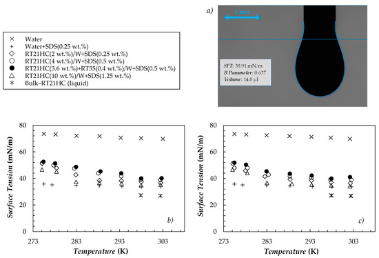 Surface tensions (SFTs) experimentally measured for water, the water+SDS mixture containing 0.25 wt.% of surfactant, bulk–RT21HC (in liquid phase) and the four PCMEs are plotted in Figure 6.