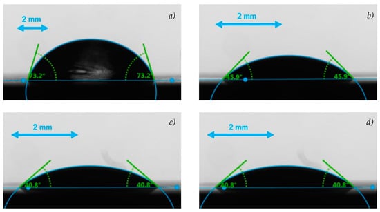 Examples of sessile drops analyzed at 278 K for: (a) water; (b) RT21HC(2 wt.%)/Water; (c) RT21HC(4 wt.%)/Water and (d) RT21HC(10 wt.%)/Water.