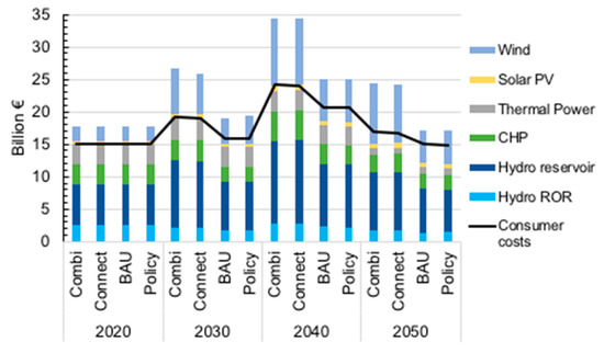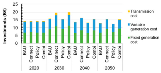 Solar photovoltaics is foreseen to grow after year 2030 and its share of the power capacity investments could approach 15–25% depending on the scenarios. All scenarios employed hourly profiles in the simulations, which in the case of solar photovoltaics (PV) is important, because of the high variability of solar radiation both on a diurnal and seasonal scale. Though the power share sounds quite substantial, the energy share of the PV of all electricity remains below 5% because of a low capacity factor of PV in northern Europe. Actually, producing PV electricity for local use in the region could be more cost-effective than importing PV electricity from the mainland Europe (scenarios Combi and Policy) with better solar radiation conditions, because imported electricity is subject to a substantial power transmission cost. The solar profile matches poorly the main energy demand in Northern Europe, which restricts its direct use. However, when accompanied with energy storage, e.g., with flexible hydro power, its usefulness increases to cover e.g., summertime uses for which diurnal storage is adequate [54]. At the same time, the wind power supply in the summertime typically drops as most of the wind resource concentrates to the autumn and winter months in the Nordic-Baltic region. As the Balmorel model only considers the bulk electricity market and is not able to handle the power distribution side, the PV is treated here as if it were a centralized option, while distributed PV closer to the end-users e.g., buildings was not considered.