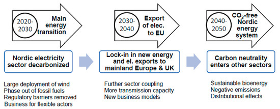 The four scenarios showed the techno-economic changes in the Nordic energy sector to reach a carbon-free energy sector. However, such profound changes also need to be embedded in the social and political systems. Therefore, the pathway to zero-carbon was also placed in a socio-technical transition framework, meaning that the final energy transition will be influenced by the co-evolution of the techno-economic system, socio-technical issues, and policy actions [5]. All three “layers” need to match to ensure the required change.