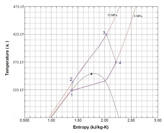 Generally, thermodynamic cycles, including the organic Rankine cycle (ORC) [5,6], Kalina cycle [7,8], and transcritical Rankine cycle (TRC) [9], which have used the low-boiling-point working fluid, are adopted to recover the low-grade energy. Of them, the TRC, which adopts the natural non-flammable and non-toxic CO2 as the working fluid (hereinafter referred as “tCO2”) [10,11,12], has more compact equipment than the Kalina cycle, and it can lead to a higher output power than ORC, thus displaying great application prospects in the field of low-grade energy utilization. However, the normal operation pressure of the tCO2 system is about 10 MPa due to the high critical pressure of CO2 (about 7.38 MPa), which will give rise to safety concerns. Another challenge is CO2 condensation in the tCO2 system as a result of the low critical temperature of CO2 (about 304 K) [13]. It is difficult to use tCO2 in areas with high surrounding temperature, especially, in arid areas with water shortage.