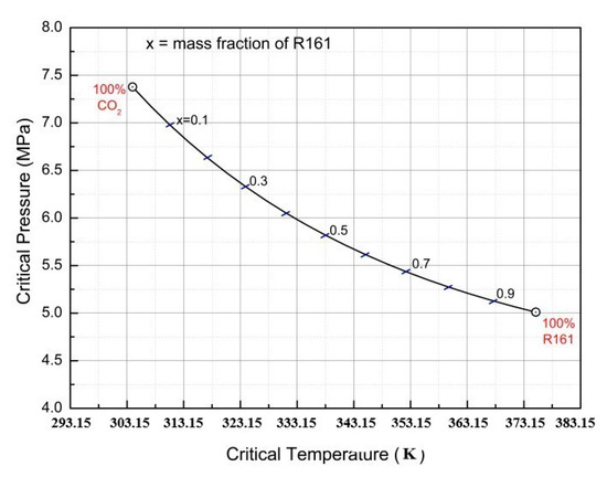 Figure 3 presents the critical pressure and critical temperature for the CO2/R161 mixtures with various mass fractions [28]. Clearly, the critical temperature of the mixtures was increased with the increase in the mass fraction of R161. Meanwhile, the critical pressure of the mixtures was decreased, which rendered a lower TRC operation pressure than that of tCO2, and laid the foundation for the practical application of TRC using CO2 mixtures.