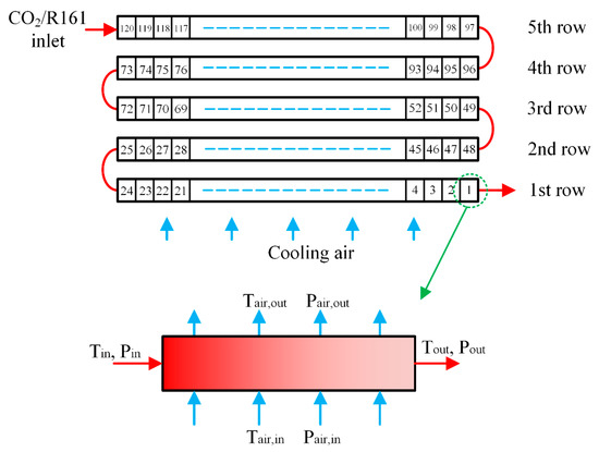 The heat exchanger in the cooling tower was made up of bundles with the same structural and functional characteristics. It can be seen in Figure 4 that each bundle was composed of 10 finned tubes arranged in five rows. Meanwhile, the working fluid would enter the bundle through the left side of the fifth row in the finned tubes and leave the bundle at the right side of the first row in the finned tubes. Then, the air would cool the working fluid by flowing from the bottom to the top of the bundle. The calculation for the heat exchanger model is also presented in Figure 4. Generally, the traditional method of heat exchanger modeling is only valid for a working fluid with constant properties. In this study, the nodal approach was adopted in designing the heat exchanger, in which each row of the heat exchanger bundles was divided into 24 sections, as if a number of small heat exchangers were connected in series.