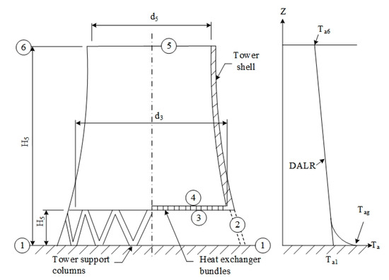 where is the air pressure at state 1 in Figure 1 (Pa), suggests the air temperature at state 1 (K), H3 represents the distance between the heat exchanger bundles bottom and the ground (m), H4 indicates the distance between the top of the heat exchanger bundles and the ground (m), H5 is the distance between the tower outlet and the ground (m), stands for the air temperature at state 4 (K), ma is indicative of the air flow (kg·s−1), is the face area of the heat exchanger bundle bottom (m2), signifies the average air density of the heat exchanger bundles (kg·m−3), A5 denotes the outlet area of the cooling tower (m2), represents the outlet air density of cooling tower (kg·m−3), and K indicates the coefficients of air loss in the NDDCT. More details are presented in Table 2.
